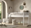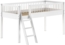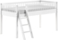 Halbhohes Bett, mit einer Liegefläche von 90 x 200 cm und schräg angestellter Leiter, ist ideal zum Spielen und Schlafen. Ein massiver Rolllattenrost mit 15 Leisten ist bereits im Lieferumfang enthalten. Ein Abenteuerspielplatz im Kinderzimmer. Das Trägermaterial ist massive Buche, weiß lackiert. Die hochwertige Auswahl des Materials drückt sich durch den Holzeinsatz und die Bearbeitung aus. Die schwarzen Schrauben sind sichtbar und setzen einen optischen Akzent. Der Absturzschutz gibt zusätzlich Sicherheit und hat eine fein gearbeitete Sprossen-Optik. Die runden Sprossen haben eine Stärke von ca. 16 mm. Der Abstand vom Boden bis Oberkante Absturzschutz sind ca. 114 cm, die Einstiegshöhe bis Oberkante Bettseite ist ca. 81,5 cm und die Höhe von der Oberkante der Bettseite bis Oberkante Absturzschutz ca. 32 cm. Die Leiter mit 3 Trittstufen (Abstand ca. 22,9 cm) wird schräg angestellt und kann rechts oder links verbaut werden, sie hat ca. 35 cm breite Trittstufen die sicheres Hinauf- und Hinabsteigen ermöglichen. Der Raum unter der Liegefläche, ist vom Boden bis Unterkante Bettseite ist ca. 72,5 cm hoch und kann noch gut als Stauraum genutzt werden. Die hochwertige Verarbeitung und sehr gute Stabilität zeichnen dieses Bett aus. Die Pfostenstärke ist ca. 55 x 55 mm. Max. Matratzenhöhe ca. 20 cm. Für Kinder unter 6 Jahren nicht geeignet. Die Ware ist zerlegt, zur einfachen Selbstmontage. Die Matratze, Kissen und Dekoration gehören nicht zum Lieferumfang. FSC®-zertifiziert und nach EN 747-2:2012+A1(2015) gebaut. Das Bett an sich ist ca. B: 207,5 x T: 97,5 cm, die Leiter benötigt eine Tiefe von ca. 38 cm. Benötigte Stellfläche halbh. Bett ca. B: 207,5 x H: 114 x T: 135,5 cm.