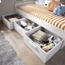 Das Kinderbett Adamello bietet eine praktische und funktionale Lösung für Schlafzimmer. Mit den Abmessungen 194 x 97 x 60 cm und einem modernen, eleganten Design ist es ideal für Kinder- und Gästezimmer. Die drei integrierten Schubladen ermöglichen eine platzsparende Aufbewahrung von Bettlaken, Kissen und Bettdecken. Hergestellt aus langlebiger Melamin-Spanplatte, ist das Bett stoß- und kratzfest sowie wasserfest.