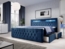 Boxspringbett Menzogna – modernes Design mit Stauraum und LED-Beleuchtung. Dieses luxuriöse Bett in Blau bietet eine Liegefläche von 120x200 cm und kombiniert schimmernden Samt mit einem individuell anpassbaren Schlafsystem. Die 5 Gang Bonnell-Federkern-Matratze sorgt für optimalen Schlafkomfort, während der PU-Schaum-Topper für erholsame Nächte sorgt. Die integrierte LED-Beleuchtung im Kopfteil schafft eine entspannende Atmosphäre. Mit zwei Schubladen bietet das Bett zusätzlichen Stauraum für Bettwäsche oder Kleidung.