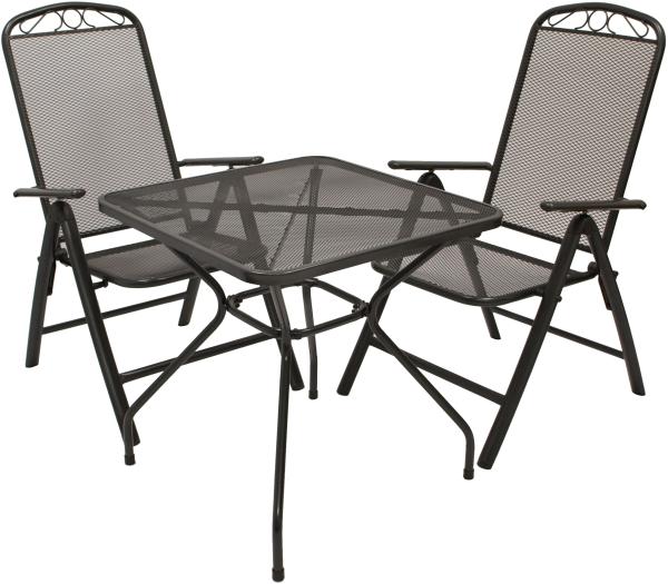 Solide Gartengarnitur CLASSIC 3-teilig aus anthrazitfarben beschichtetem Streckmetall. Die Garnitur besteht aus 2 Klappsesseln mit einer 5-fach verstellbaren Rückenlehne und einem Tisch mit den Maßen 70 x 70 cm. Die Sessel bieten extra Komfort und der Tisch bietet Platz für 2-4 Personen.