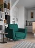 Der Designer Sessel Selene in Grün vereint Gemütlichkeit und modernes Design. Mit einer großzügigen Sitzfläche von 80 x 64 cm und einem komfortablen Kissen von 63 x 53 cm bietet er hervorragenden Sitzkomfort. Die hohen Armlehnen und kompakten Abmessungen von 99 cm Höhe und 99 cm Tiefe machen ihn ideal für verschiedene Räume. Die filigranen Metallfüße verleihen dem Sessel eine elegante Note.