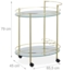 Ovaler Servierwagen mit 2 Ablagen von Relaxdays, ideal für Küche, Wohn- und Essbereich. Der elegante Küchenwagen aus Metall und Glas in Messingoptik bietet viel Stauraum mit einem Flaschenhalter und zwei Ebenen. Mit seinen kompakten Maßen von 79 x 45 x 65,5 cm und einer Tragkraft von je ca. 5 kg pro Ablage ist er sowohl praktisch als auch stilvoll.