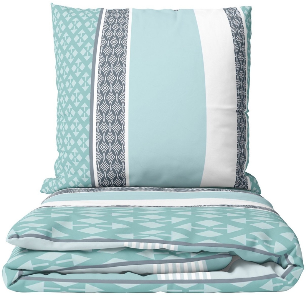 Das Design überzeugt mit einer stilvollen Kombination aus Streifen, Rauten und Ornamenten in Türkis, Weiß und Grau – frisch, harmonisch und zeitlos.