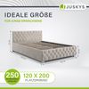 Das Juskys 'Nizza' Polsterbett (120 x 200 cm) in Beige vereint stilvolles Design mit praktischen Funktionen. Das hohe Kopfteil mit Chesterfield-Steppung und Samtbezug bietet optimalen Komfort. Der gefederte Lattenrost sorgt für erholsamen Schlaf, während die energiesparende LED-Beleuchtung eine angenehme Atmosphäre schafft. Der großzügige Bettkasten bietet viel Stauraum für Bettwäsche und mehr. Das Polsterbett wird inklusive Lattenrost geliefert.