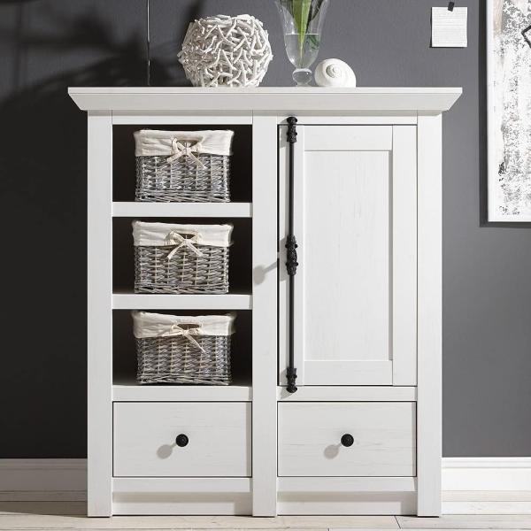 Dielen-Kommode, Highboard WINGST-61 im Landhaus Stil Dekor Pinie weiß Nb. mit formschönen Antik-Riegeln B/H/T ca. 105 x 115 x 45 cm