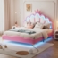 Das Prinzessinnenbett „Crown“ ist der Traum jeder kleinen Prinzessin. Mit einem verspielten Wolken-Design und zarten rosafarbenen Akzenten verwandelt es jedes Kinderzimmer in eine märchenhafte Welt. Das Kopfteil ist weich gepolstert und mit pflegeleichtem Kunstleder überzogen. Die integrierte LED-Beleuchtung sorgt für ein stimmungsvolles Ambiente, das über eine 24-Tasten-Fernbedienung individuell gesteuert werden kann.