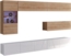 Die „Kossana 4“ Wohnwand ist die perfekte Wahl für alle, die stilvolle und funktionale Möbel im Wohnzimmer schätzen. Mit einer Breite von 255 cm bietet dieses Set vielseitige Aufbewahrungs- und Präsentationsmöglichkeiten für Ihre Wohnaccessoires und Unterhaltungselektronik. Hauptmerkmale: Garnitur-Unterteil: Korpus Goldeiche matt/Front Goldeiche matt. Oberteil des Sets: Korpus weiß matt/Front weiß glänzend, 255 cm Breite, Laminierte Möbelplatte, 3x Hängeschrank (105/34/32 cm), 1x Hänge-Vitrine mit Glaseinlegeboden (45/117/32 cm), 1x TV-Schrank (100/37/43 cm), 1x TV-Schrank (150/37/43 cm), Push-to-Open-System, Zur Wandmontage vorgesehen (Hinweis: Dübel sind nicht für Gipskartonwände geeignet), Beschläge enthalten, LED-Beleuchtung nicht enthalten, Lieferung in 6 Paketen mit klarer Montageanleitung. Dieses Wohnzimmer komplett Set eignet sich hervorragend für Personen, die eine harmonische und moderne Einrichtung bevorzugen. Die Kombination aus Hängeschränken und Vitrine ermöglicht es, Dekorationsgegenstände stilvoll zu präsentieren und gleichzeitig ausreichend Stauraum für alltägliche Gegenstände zu bieten. Die TV-Schränke bieten Platz für Ihre Unterhaltungselektronik und sorgen für ein aufgeräumtes Erscheinungsbild. Unsere Wohnzimmerwand vereint modernes Design mit praktischer Funktionalität – die ideale Wahl für Ihr Zuhause!