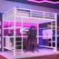 Hochbett, 140x200 cm, mit Ambientelicht, Schreibtisch, Steckdose und USB-Anschluss. Die solide Konstruktion aus hochwertigem Eisen und MDF sorgt für Langlebigkeit. Unter dem Bett sorgt eine Lichtleiste für eine gemütliche Atmosphäre. Mit drei Schubladen und Regalen bietet es reichlich Stauraum. Der Schreibtisch ist ideal für Arbeit und Lernen, während Geländer und Treppe für Sicherheit sorgen.