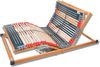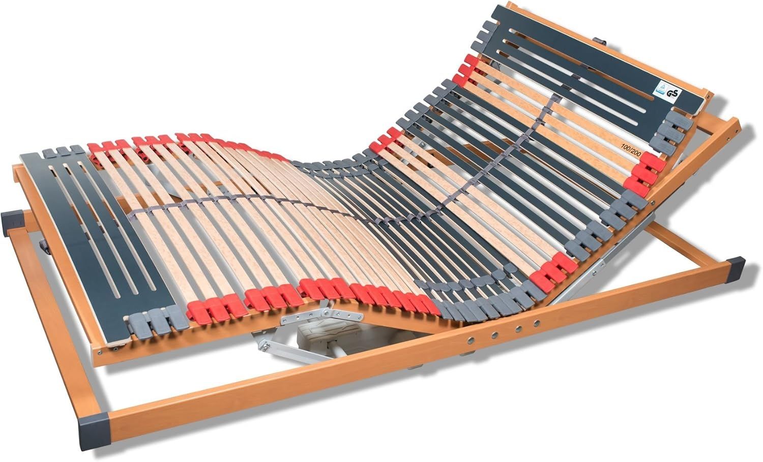 7 Zonen Lattenrost Rhodos EL Kopf- und Fußteil elektrisch verstellbar Der elektrisch verstellbare Lattenrost Rhodos EL besticht durch seine Qualität und Funktion. Als einziger Elektrorahmen bietet er die Möglichkeit den starken Doppelmotor rechts oder links zu platzieren (ausser Größe 80x200 und 140x200). Die in federnden Trio-Kautschukkappen gelagerten und mehrfach verleimten, flexiblen Federholzleisten sind holmüberdeckend, somit gibt es keine Lücke im Doppelbett. Der körpergerechte Liegekomfort wird durch 2x9 Härtegradeinstellungen unterstützt. Diese sorgen für die individuelle Einstellung des Bettrostes auf Ihr Körpergewicht, damit Ihre Wirbelsäule möglichst gerade beim Schlaf in der Seitenposition 'gebettett' ist. Die zwei voneinander unabhängigen Motoren werden mit einem Sicherheitshandschalter einzeln oder zusammen verstellt. Die Motoren sind geräuscharm, bärenstark und verfügen über eine Netzfreischaltung und Notabsenkung, somit wird nur minimal Strom verbraucht und bei Stromausfall wird ein hochgeklapptes Lattenrost wieder notabgesenkt damit Sie besser aus dem Bett kommen. Der Mittelgurt garantiert eine optimale Gewichtsverteilung. Die Höhe des stabilen Schichtholzrahmen inklusive der Federholzleisten (Motor nicht mitgerechnet) beträgt 10 cm. Für den Motor und das Gestänge wird ca. 13 cm Luft unter dem Lattenrost benötigt. Der Lattenrahmen wird fertig montiert geliefert, kein Bausatz!! Der Lattenrost ist vom TÜV Rheinland GS geprüft. Er kann bis max. ca. 180 kg belasted werden Der bestprämierteste Elektrorahmen den Sie im Internet finden können: Rhodos EL mit Funk- oder kabelgebundener Bedienung. Ein Muss für Gesundheit und Komfort zum günstigsten Preis. Der 7 Zonen Lattenrost Rhodos EL elektrisch verstellbar wurde seit 2016 zum 'Testsieger Lattenroste 90x200 cm' bei vergleich. org prämiert bzw. ist seither Vergleichssieger in der Kategorie Lattenroste elektrisch 90x200 cm, aber auch auf anderen Portalen prämiert. 1te Zone: Kopfzone Flexible Lagerung des Kopfes durch das neue innovative 4in1-System 2te Zone: Halswirbelbereich Feste Stütze im Halswirbelbereich 3te Zone: Schultereinsinkbereich Unterstützt durch separate und weich gearbeitete Federholzleisten und Kautschukkappen 4te Zone: Lordosenunterstützung festere Triokautschukkappen gelagerte Federholzleisten 5te Zone: Beckeneinsinkbereich weichere in Triokautschukkappen gelagerte Federholzleisten Beckenbereich mit 9 Liegehärteeinstellung 6te Zone: Oberschenkelbereich 15 Federholzleisten in Triokautschukkappen flexibel gelagert 7te Zone: Ferseneinsinkbereich Unterschenkel- mit integriertem Ferseneinsinkbereich durch das 4in1-System