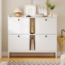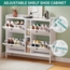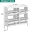 Praktischer Schuhschrank mit 4 Klappen und den Maßen 108 x 27,5 x 95,5 cm, ideal für die Aufbewahrung von bis zu 16 Paar Schuhen. Das platzsparende Design fügt sich perfekt in enge Ecken ein und bietet zusätzlich 2 offene Regale für Dekoration oder Alltagsgegenstände. Hergestellt aus robustem Holzwerkstoff, sorgt dieser Schuhkipper für Stabilität und Sicherheit. Die einfache Montage ermöglicht einen schnellen Aufbau.