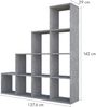 Aus melaminbeschichteten Spanplatten gefertigt, ist das Treppenregal 142 cm hoch, 137,6 cm breit und 29 cm tief. Die 10 geräumigen Staufächer mit den Innenmaßen von 33 x 33 x 29 cm (HxBxT) sorgen im Zimmer für praktischen Stauraum.