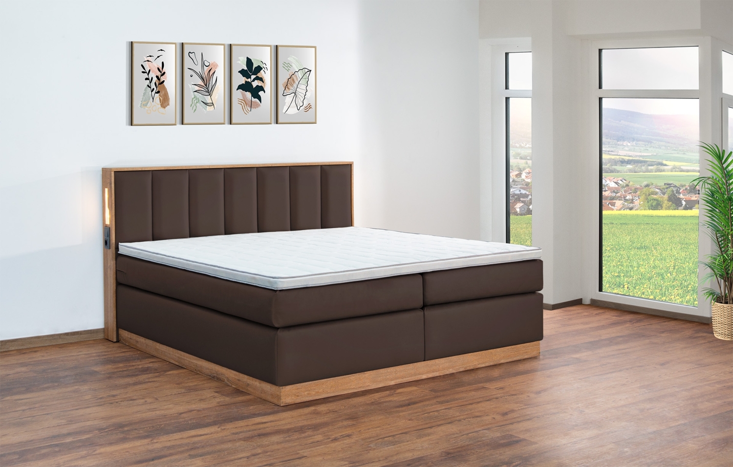 Meisterbetten Boxspringbett Sely mit Holzdekor Eiche Cognac 160x200 in LM-Braun, Matratzenbezug Nano, Midisoft-Topper