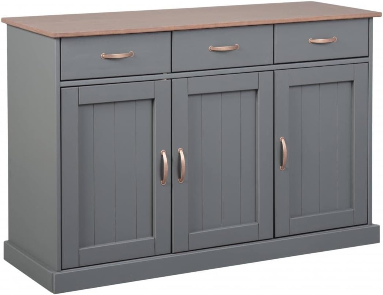 Dmora Buffet mit 3 Türen und 3 Schubladen, in grau lackierter massiver Kiefer mit brauner Oberseite und Oberflächen, 131 x 45 x 86 cm