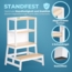 Für optimale Standfestigkeit und Stabilität sorgt die trapezförmige Form des Unterteils mit extra breiter Stehfläche und einer 2 cm tiefer gelegten Treppenstufe am Einstieg mit Anti-Rutschfüßen. Die Ecken des Möbelstücks sind abgerundet, das natürliche Kiefernholz wird durch Lack versiegelt, der natürlich schadstofffrei ist. Die Oberfläche ist pflegeleicht und kann einfach mit einem feuchten Tuch abgewischt werden. Ein cleveres Gimmick für Eltern: Praktische Schutzpads, die an der Vorderseite des Lernturms angebracht werden können, schützen die Anstellfläche vor Kratzern. Wenn das Kind größer geworden ist, kann der obere Teil abgenommen und der untere Teil weiter als Tritthocker genutzt werden, der wegen seiner Belastbarkeit bis 100 kg auch für Erwachsene geeignet ist.