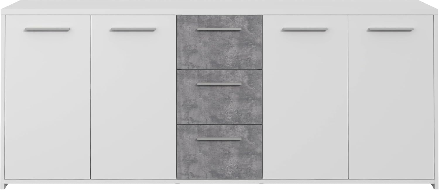 Das Forte PILVI Sideboard 180 ist ein modernes Möbelstück, das mit vier Türen und vier Schubladen großzügigen Stauraum bietet. Die elegante Kombination aus Weiß und Betonoptik verleiht Ihrem Wohn- oder Schlafzimmer einen urbanen Look. Hergestellt aus hochwertigem Holzwerkstoff, ist die Oberfläche strapazierfähig und pflegeleicht, ideal für den täglichen Gebrauch. Das durchdachte Design sorgt für eine harmonische Raumintegration und praktische Funktionalität.