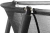 Der Stahlrahmen ist verzinkt, schwarz glänzend beschichtet und gibt dem Trampolin eine sichere Basis. Das Sicherheitsnetz ist so konzipiert, dass es optimalen Schutz und Sicherheit beim Springen bietet. Die Konstruktion des Oberrings aus Stahl sorgt dafür, dass das weiche, feinmaschige Netz in einer eleganten Form gehalten wird und dadurch besonders schön gespannt bleibt. Der Eingang des Sicherheitsnetzes ist mit einem doppelseitigen Reißverschluss versehen, sodass du das Trampolin einfach betreten und das Netz wieder gut verschließen kannst.