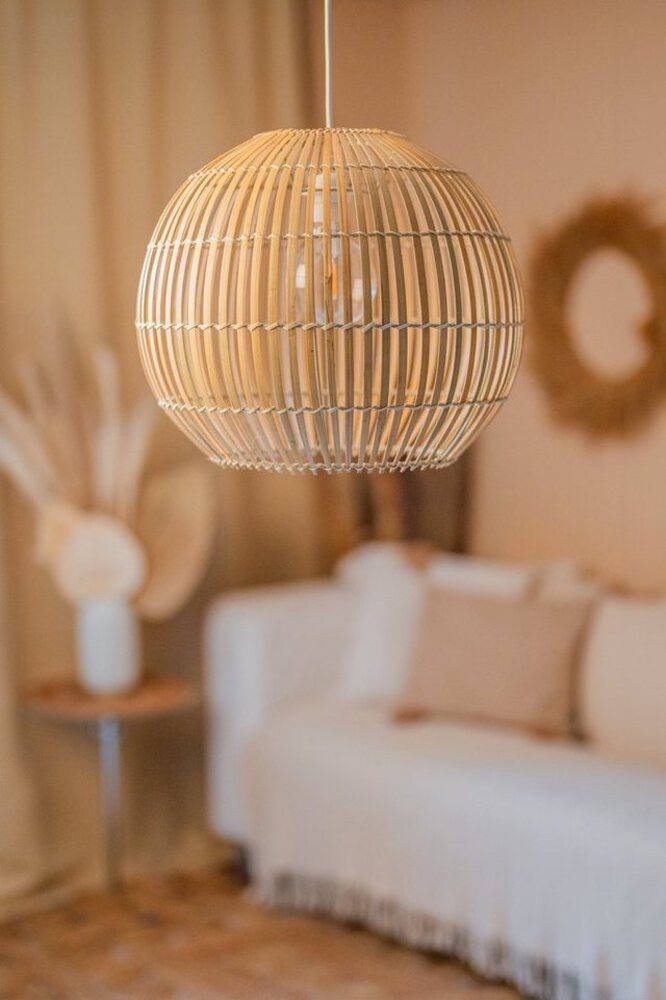 Entdecken Sie die Bambus Hängeleuchte Siena mit einem Durchmesser von 40 cm, die eine warme und gemütliche Atmosphäre schafft. Das handgefertigte Bambusgeflecht sorgt für sanfte Lichtstreuung und beeindruckende Schattenspiele. Ideal für verschiedene Räume, fügt sich die Lampe harmonisch in jeden Einrichtungsstil ein. Mit einer Höhe von 35 cm und einem weißen Kabel von 1,80 m ist die Installation einfach und flexibel.