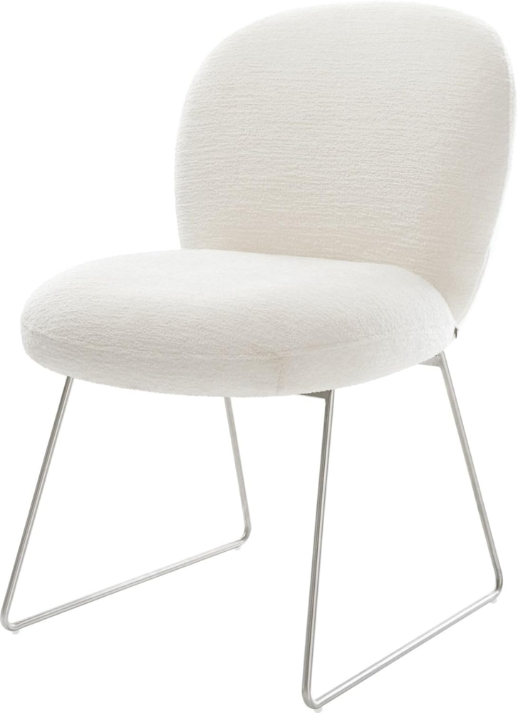 Der Esszimmerstuhl Nube-Flex vereint modernes Design mit außergewöhnlichem Komfort. Die bequeme Schalenschale aus trendigem Bouclé-Stoff in Beige und das elegante Kufengestell aus handgebürstetem Edelstahl bieten nicht nur eine ansprechende Optik, sondern auch eine hohe Belastbarkeit von bis zu 150 kg. Die hochwertige Polsterung mit Taschenfederkern sorgt für eine punktelastische Unterstützung und entlastet die Wirbelsäule.