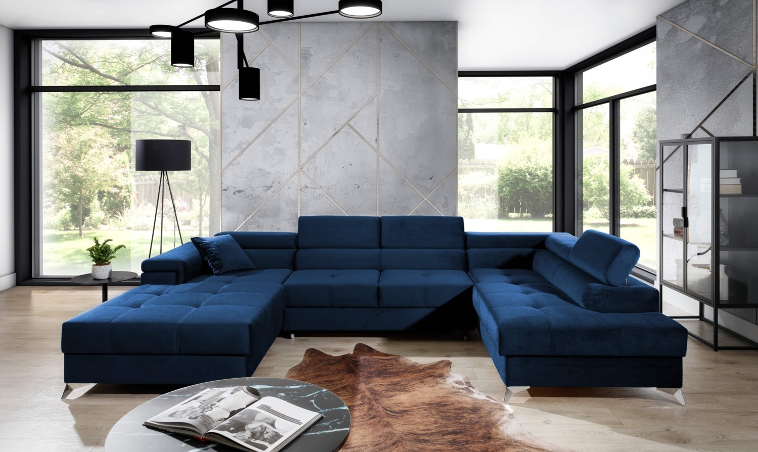 Das Eltap Eduardo Ecksofa (Kronos 09) in Dunkelblau ist ein stilvolles und komfortables Möbelstück, das mit seinen großzügigen Maßen von 205 x 88 x 337 cm sowohl tagsüber als auch nachts für Entspannung sorgt. Die integrierte Schlaffunktion mit einer Liegefläche von 127x273 cm und die praktische Dolphin-Funktion ermöglichen eine mühelose Umwandlung in ein Bett. Verstellbare Kopfstützen, breite Armlehnen und ein großer Bettkasten in der Ottomane runden das Angebot ab.