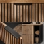 Die gerillte Eichenfront mit schwarzen Linien schafft Ruhe und Charakter, während das schwarze Waschbecken mit goldfarbener Marmorierung zum echten Blickfang wird. Hängeschränke, Hochschrank und LED-Spiegel greifen das Design auf und fügen sich harmonisch ins Gesamtbild. Ein Set, das nicht laut ist – aber Eindruck hinterlässt.