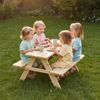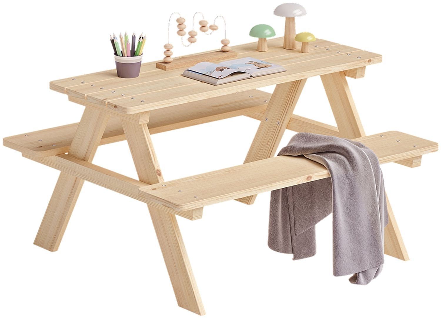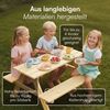 Mit kompakten Maßen von 50 × 83 × 89 cm passt die Sitzgruppe perfekt in Gärten, auf Terrassen oder Balkone. Der Tisch bietet ausreichend Platz für Bastelmaterialien, Snacks und Spielsachen, während die zwei stabilen Sitzbänke ohne Lehne viel Bewegungsfreiheit und Flexibilität bieten.