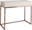 Der AX LIVING Schminktisch Lortie vereint modernes Design mit praktischer Funktionalität. Mit einer Breite von 80 cm und einer Tiefe von 35 cm ist er ideal für kompakte Räume. Die 18 mm starke Tischplatte in Kaschmir und das kupferfarbene Metallgestell aus 20 mm Vierkantprofil verleihen dem Tisch eine elegante Ausstrahlung. Zwei geräumige Schubladen (Höhe: 11,5 cm) bieten ausreichend Stauraum für Kosmetik und Accessoires.