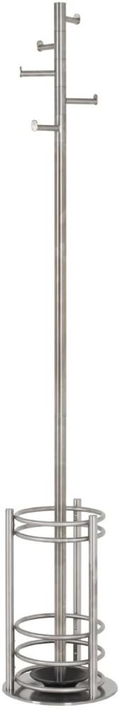 Ausführung Gestell: Edelstahl Fußplatte aus massivem Edelstahl Abtropfschale: Kunststoff in schwarz Ausstattung mit integriertem Schirmständer 5 Garderobenhaken Lieferumfang 1 Garderobenständer ohne Dekoration