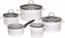 Topfset Emaille BALTRUM, 5-tlg. Bestehend aus: 1 Fleischtopf mit Deckel 1,3 L, 1 Fleischtopf mit Deckel 2,6 L, 1 Fleischtopf mit Deckel 5,5 L, 1 Stieltopf mit Chromrand 1,3 L, 1 Milchtopf mit Ausguss 1,0 L. Geeignet für alle Herdarten, auch für Induktions-Kochfelder. Farbausführung: außen weiß mit grauen Punkten, innen grau mit Literskala.