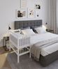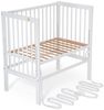 Aus massivem, weiß lackiertem Buchenholz gefertigt, stellt das Beistellbett 'BOXSPRING' eine interessante Schlaflösung für Babys in den ersten Lebensmonaten dar. Das Bettchen, das direkt am Elternbett montiert wird, bietet eine sehr geräumige Liegefläche von 90x55 cm. Der Lattenrost ist ab 40 cm bis zu einer Matratzenhöhe von 73 cm stufenlos höhenverstellbar, sodass das Beistellbett von FabiMax an Boxspringbetten angebracht werden kann. Für eine sichere Montage an Boxspringbetten ist ein spezielles Befestigungsset in der Lieferung enthalten.