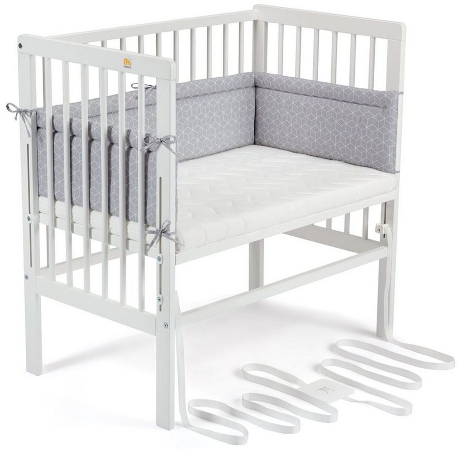 Zusammen mit dem Bettchen werden eine Matratze 'CLASSIC' und ein Nestchen im Design „graue Würfel“ mitgeliefert. Die Matratze ist mit einem Matratzenkern aus PU-Markenschaum ausgestattet, der von einem beidseitig versteppten Bezug geschützt wird. Der Matratzenbezug lässt sich durch den praktischen Reißverschluss abnehmen und kann bis 60°C gewaschen werden.