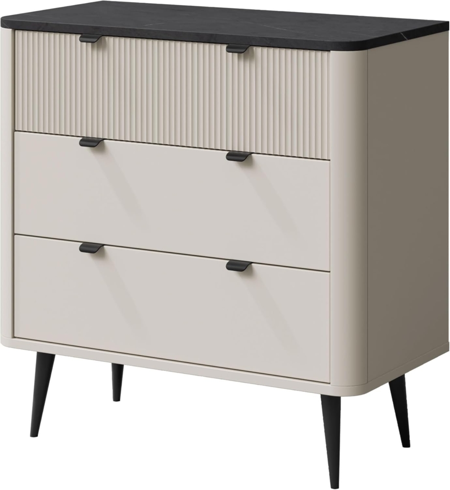 Die Kommode Rotevio 3S RE11 vereint modernes Design mit praktischer Funktionalität. Mit einer Breite von 90 cm, einer Höhe von 82 cm und einer Tiefe von 40 cm bietet sie ausreichend Stauraum in drei Schubladen. Der Korpus aus 18 mm Laminatplatte und die Fronten aus 18 mm MDF-Platte sorgen für Stabilität und Langlebigkeit. Die gedämpften Gleitschienen und die eleganten Metallfüße in Schwarz runden das Gesamtbild ab.