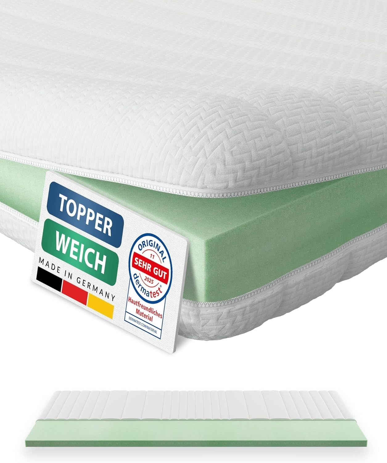 Der AM Qualitätsmatratzen Basic Topper 140 x 190 cm bietet Ihnen eine weiche und anpassungsfähige Matratzenauflage, die ideal für Boxspringbetten geeignet ist. Mit einer Höhe von ca. 6 cm und einem Komfortschaum (RG 35) sorgt er für ein angenehmes Liegegefühl und verbessert die Anpassungsfähigkeit an den Körper. Der atmungsaktive Bezug aus Doppeltuch unterstützt die Regulierung von Temperatur und Feuchtigkeit und ist bei 60 °C waschbar. Hergestellt in Deutschland, bietet dieser Topper höchste Qualität und Allergikerfreundlichkeit.