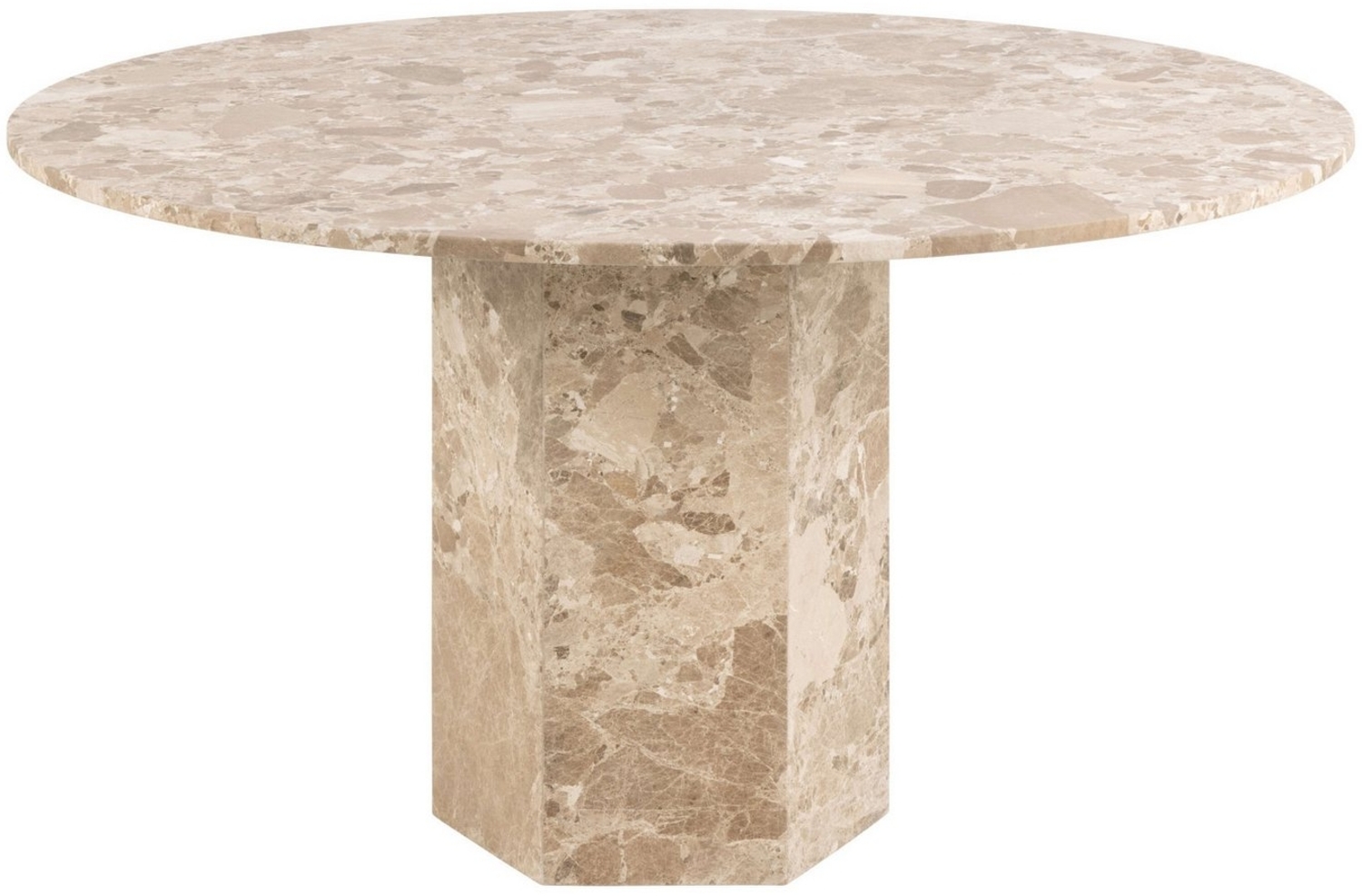 Schicker runder Esstisch »Naxos« von ACTONA GROUP, matt Latte lackiert mit einer Tischplatte aus Marmor. Mit einem Durchmesser von 130 cm und einer Höhe von 75 cm bietet er ausreichend Platz für gesellige Runden. Das Säulengestell sorgt für viel Beinfreiheit, während die maximale Belastbarkeit bei 100 kg liegt. Der Tisch vereint skandinavisches Design mit einer angenehmen Haptik und einem sanften Schimmer.