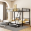 Das wandelbare Dreibett-Etagenbett bietet eine Liegefläche von 140x200 cm sowie zwei Liegeflächen von 90x200 cm und ist ideal für Familien und Gäste. Der pulverbeschichtete Metallrahmen in Schwarz sorgt für Stabilität und eine pflegeleichte Oberfläche. Mit zwei großen Ausziehschubladen und 66 Lattenrosten bietet es zusätzlichen Stauraum und gleichmäßige Unterstützung der Matratzen. Das Bett ist in drei separate Betten teilbar und überzeugt durch modernes Design.
