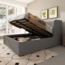 Dieses Polsterbett mit einer Liegefläche von 160x200 cm vereint modernes Design und Funktionalität. Der graue Leinenbezug und die breiten Seitenlehnen sorgen für eine stilvolle Ausstrahlung. Dank des hydraulischen Hebesystems lässt sich der Bettkasten mühelos öffnen, während die stabile Konstruktion eine Belastbarkeit von bis zu 300 kg gewährleistet. Die Matratzenaufnahme ist versenkt, um ein Verrutschen zu verhindern.
