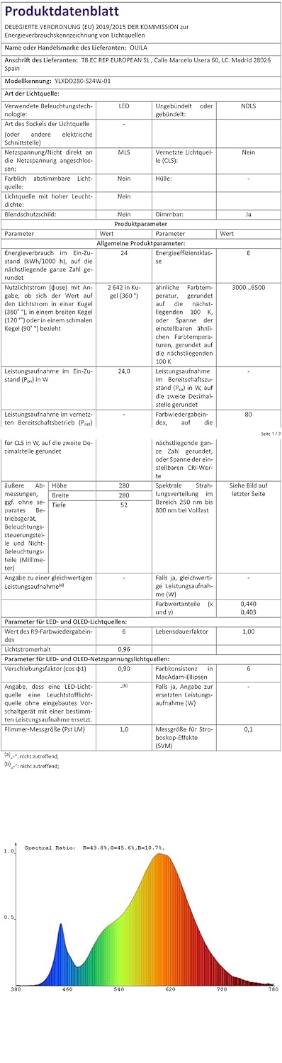 Die OUILA LED Deckenleuchte Dimmbar ist eine vielseitige 24W Deckenlampe, die mit einer Fernbedienung ausgestattet ist. Sie ermöglicht eine stufenlose Anpassung der Farbtemperatur von 3000K bis 6500K sowie der Helligkeit von 10% bis 100%. Mit 7 RGB-Farben und einer hohen Lichtdurchlässigkeit sorgt sie für ein angenehmes Ambiente in jedem Raum. Die Installation ist einfach und ohne Elektriker möglich, während die IP44 Wasserdichtigkeit und der Short Circuit Schutz für Sicherheit sorgen.