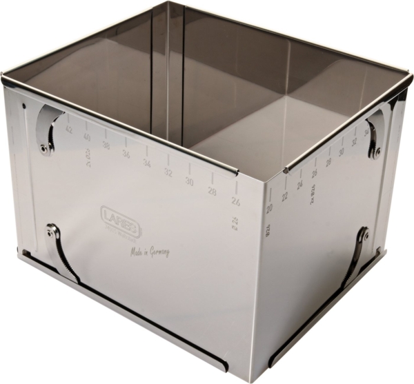 Vielseitiger Backrahmen aus rostfreiem Edelstahl mit stufenlos verstellbarer Größe bis 33x42 cm und einer Höhe von 18 cm. Ideal für mehrstöckige Torten und kreative Dessertideen. Die integrierte Skalierung ermöglicht eine präzise Handhabung, während das clevere Design für saubere Ergebnisse sorgt. Langlebig und spülmaschinengeeignet, ist dieser Backrahmen ein unverzichtbares Utensil für Hobbybäcker und Profis.