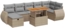 | Lieferumfang | 1x Gartentisch, 4x Ecksofa (mit Stauraum und wasserfestem Beutel), 1x Hocker (mit Stauraum und wasserfestem Beutel), 5x Sitzkissen (mit abnehmbarem und waschbarem Bezug), 6x Rückenkissen |