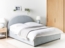 Minimalistisches Bett mit Stauraum in hellblauem Stoff, ideal für einen edlen Retro-Stil. Das Bett verfügt über ein halbrundes Kopfteil, einen hochklappbaren Lattenrost und bietet praktischen Stauraum für Kissen und Bettzeug. Die pflegeleichte und langlebige Polsterung ist besonders haustierfreundlich. Mit einer Liegefläche von 160x200 cm und einer maximalen Belastung von 350 kg ist es sowohl komfortabel als auch funktional.