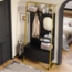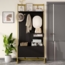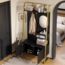Dieser kompakte Flurschrank in Schwarz vereint Spiegel, Metallhaken, Regale und Stauraum in einem modernen Design. Das offene obere Regal eignet sich ideal zur Präsentation von Dekoration, während der integrierte Spiegel das Styling erleichtert. Der Doppeltürschrank und das Schuhfach bieten großzügigen Stauraum für Schuhe und Taschen. Soft-Close-Scharniere sorgen für ein sanftes Öffnen der Türen. Perfekt für schmale Flure und kleine Wohnungen.
