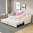 "Dieses Polsterbett verbindet modernes Design mit flexibler Funktionalität und schafft eine angenehme, wohnliche Atmosphäre im Schlaf- oder Gästezimmer. Die dezente Leinenoptik in Beige und die gepolsterten Armlehnen mit Nieten verleihen dem Möbelstück