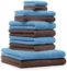 Hochwertiges 10-tlg. Handtuch-Set von Betz in den Farben Hellblau und Nussbraun. Dieses Set besteht aus 100% Baumwolle und bietet mit einer Qualität von 470 g/m² flauschige Weichheit und hohe Saugkraft. Es umfasst zwei Duschtücher, vier Handtücher, zwei Gästetücher und zwei Waschhandschuhe, die ideal für ein Wohlfühl-Ambiente sind.