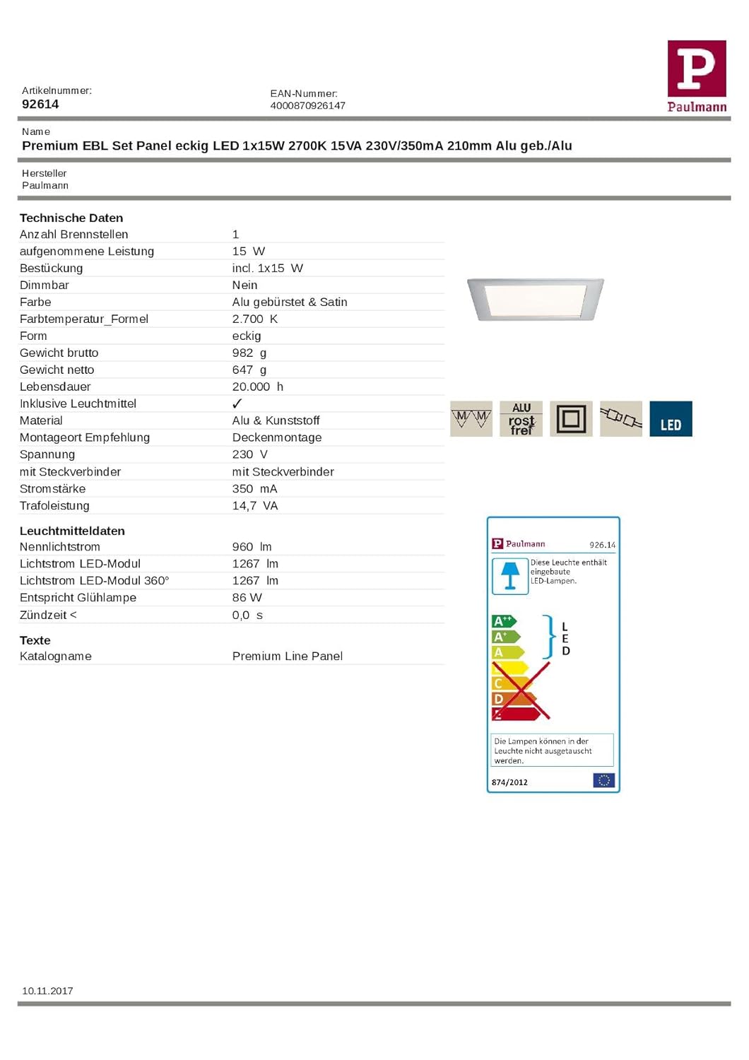 Das Paulmann Premium Einbauleuchten Set Panel eckig LED überzeugt durch seine flache Bauweise und optimale Lichtverteilung. Mit einer Leistung von 15 W und einer warmweißen Farbtemperatur von 2700 K ist es ideal für verschiedene Anwendungen. Das Set enthält eine Leuchte aus gebürstetem Aluminium und Kunststoff, die energiesparende LED-Technik nutzt und bis zu 80 % Energie im Vergleich zu herkömmlichen Glühlampen spart.