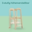 Der Bebeconfort Hoya Montessori Lernturm ist ideal für Kinder im Alter von 1,5 bis 6 Jahren (10–30 kg). Mit einem Gewicht von nur 6,2 kg und einem langlebigen Design aus lackiertem Holz ist er leicht zu bewegen und einfach zu reinigen. Der Lernturm bietet drei höhenverstellbare Stufen, um Ihrem Kind Sicherheit und Stabilität beim Spielen und Lernen zu gewährleisten. Er erfüllt die aktuellen Sicherheitsnormen der EU und ist mit einer Sicherheitsvorrichtung ausgestattet.