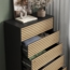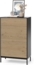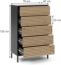 Die Kommode Eliza in Schwarz/Eiche ist ein stilvolles und funktionales Möbelstück für Ihr Schlafzimmer. Mit den Maßen 76 x 120 x 40 cm bietet sie ausreichend Stauraum in 5 geräumigen Schubladen. Der praktische push-to-open Mechanismus ermöglicht ein müheloses Öffnen und Schließen der Schubladen. Hergestellt aus MDF und Metall, ist die Kommode pflegeleicht und leicht zu reinigen, sodass Sie lange Freude daran haben.