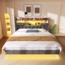 Entdecken Sie das Retro-Bettgestell mit LED-Beleuchtung und praktischer 4-in-1-Ladestation. Das elegante Kopfteil aus grauem Leinenstoff bietet nicht nur eine weich gepolsterte Rückenlehne, sondern auch Stauraum durch beidseitige Aufbewahrungstaschen. Mit einer maximalen Tragkraft von 300 kg und einem 15 cm hohen Bettfuß ist es sowohl stabil als auch funktional. Genießen Sie die RGB-LED-Beleuchtung mit über 60.000 Farben, die per App oder Fernbedienung gesteuert werden kann.