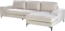Gemütliches, freistehendes Ecksofa KIRUNA in hellem Beige mit Chaiselongue und losen Rückenkissen. Der stabile Holzrahmen ist mit dickem Schaumstoff gepolstert und mit einem strapazierfähigen Samtbezug versehen. Die breite Sitzfläche bietet Platz für 4 bis 6 Personen, während die gut verarbeiteten Rückenkissen und breiten Armlehnen den Wohlfühlcharakter unterstreichen. Die abnehmbaren Kissenbezüge ermöglichen eine einfache Reinigung.