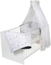 Kombi-Kinderbett 70x140 cm, Kopf- und Fußteil sind aus Melamin Dekor weiß, Gitterseiten mit 3 Schlupstäben aus massiv Buchenholz, weiß lackiert; Lattenrost aus massiv Buchenholz, 3-fach höhenverstellbar; inkl. Matratze, Himmelstange und textiler Ausstattung "Origami Black" bestehend aus 2-teiliger Bettwäsche und Himmel; mit dem mitgelieferten Umbaukit kann das Bett zum Juniorbett umgebaut werden; das Bett wird zerlegt geliefert