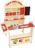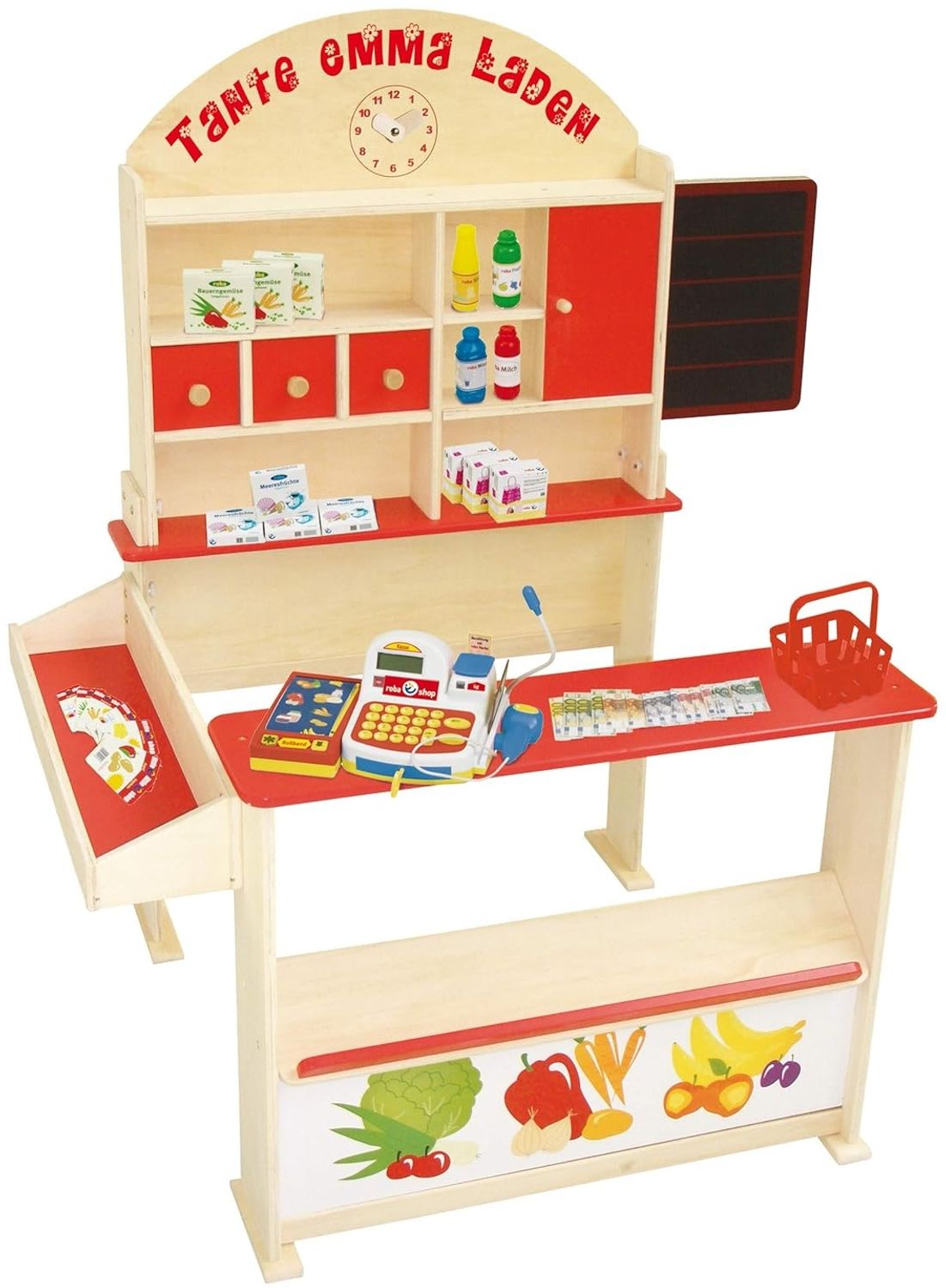 Der roba Kaufladen 'Tante Emma' aus naturbelassenem Holz bietet viel Platz für kreative Rollenspiele. Mit Regalflächen, einer Frontablage und einer Seitentheke können Kinder ein vielfältiges Warensortiment präsentieren. Eine seitliche Schreibtafel und eine Spieluhr sorgen für zusätzlichen Spielspaß. Beim Rollenspiel lernen die Nachwuchskaufleute spielerisch zu kommunizieren und mit Mengen sowie Zahlen umzugehen. Der Kaufladen entspricht der Spielzeug-Norm EN71-1:2014 und ist schadstoffgeprüft und zertifiziert. Er trägt zudem das EPH Qualitätssiegel des Institutes für Holztechnologie. Die abwischbaren und pflegeleichten Oberflächen machen die Reinigung einfach. Der Verkaufsstand hat die Maße 113 x 103 x 75 cm und ist ein ideales Geschenk für Kinder im Kindergartenalter.