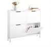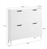 Material: MDF(E1), Metall, weiß lackiert. Gewicht: ca. 23,6kg, Belastbarkeit: bis 60kg. Produktmaße: BHT ca. 100 x 91 x 19 cm (Siehe Abbildung). Paketmaße: 110 x 17 x 45 cm. Mit den 4 Klappen können Sie eine große Auswahl an Schuhen in verschiedenen Größen und Ausführungen aufbewahren. Dieses Schuhregal kann mit Sicherheitsbeschlägen an der Wand befestigt werden, damit es nicht umkippt. Die Beine bestehen aus Metall, sind dazu sehr strapazierfähig und hält zahlreichen Belastungen stand. Lieferumfang: - 1 x Schuhschrank. - 1 x Anleitung. - 1 x Zubehörbeutel.